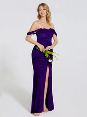 weitese's Elevate your formal look with this black satin off-shoulder mermaid maxi dress. It features a satin fabric for luxurious shine, an off-shoulder design with ruched detailing for elegant allure, and a high slit for dynamic movement. The mermaid silhouette offers a flattering fit, making it perfect for evening galas, cocktail parties, or any occasion where you want to showcase timeless sophistication with a blend of glamorous satin and refined detailing.