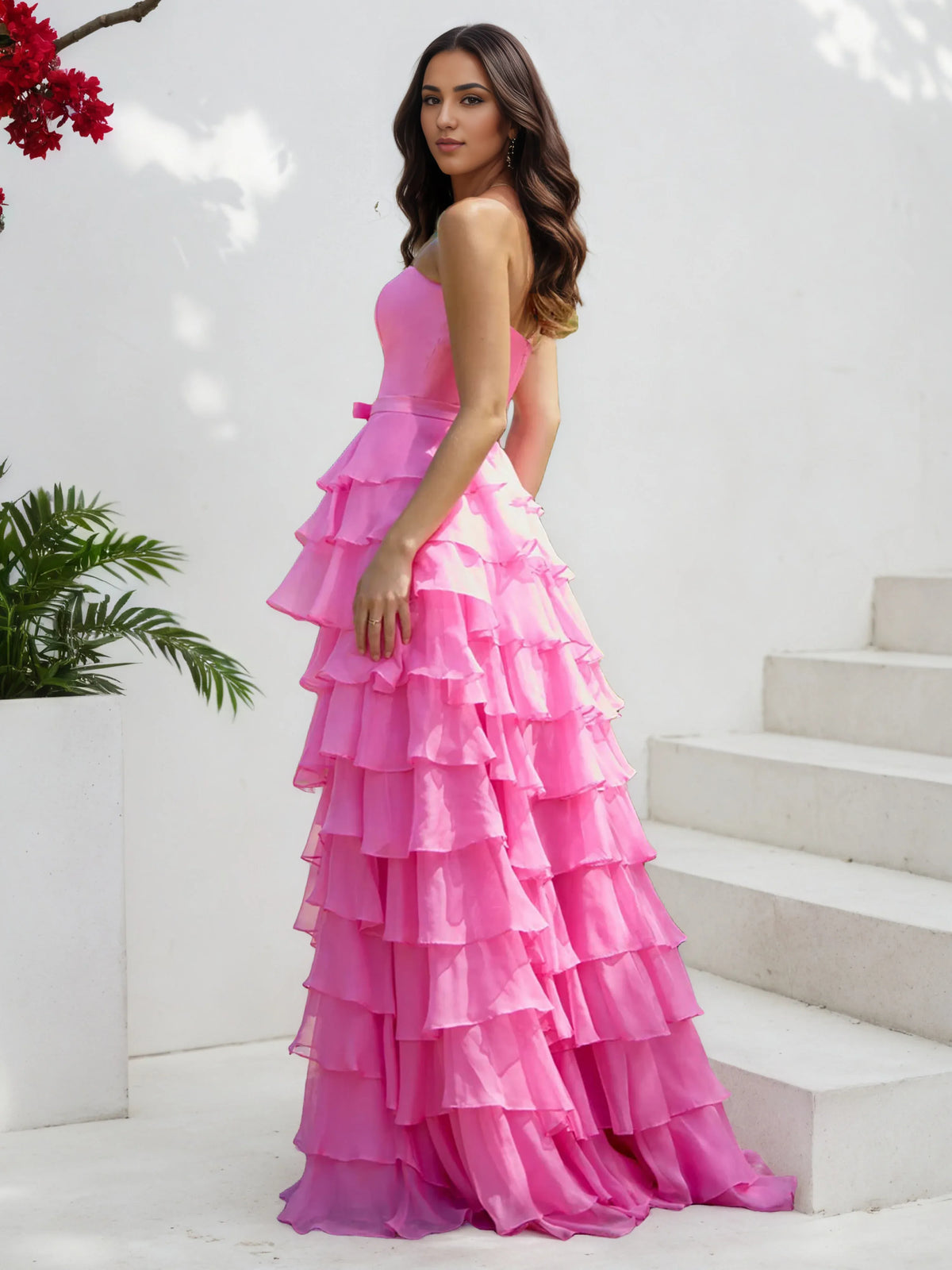 weitese's Elevate your formal look with this hot pink strapless ruffled maxi dress. It features a lightweight chiffon fabric for graceful movement, a strapless design with a bow-accented waist for playful charm, and tiered ruffled detailing for romantic allure. The side slit adds dynamic style, making it perfect for garden weddings, cocktail parties, or any occasion where you want to showcase bold sophistication with a blend of airy texture and vibrant color.