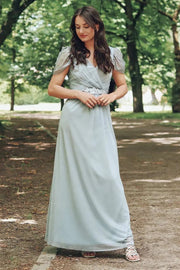 Vestido largo de dama de honor con mangas cortas y corte en A de gasa