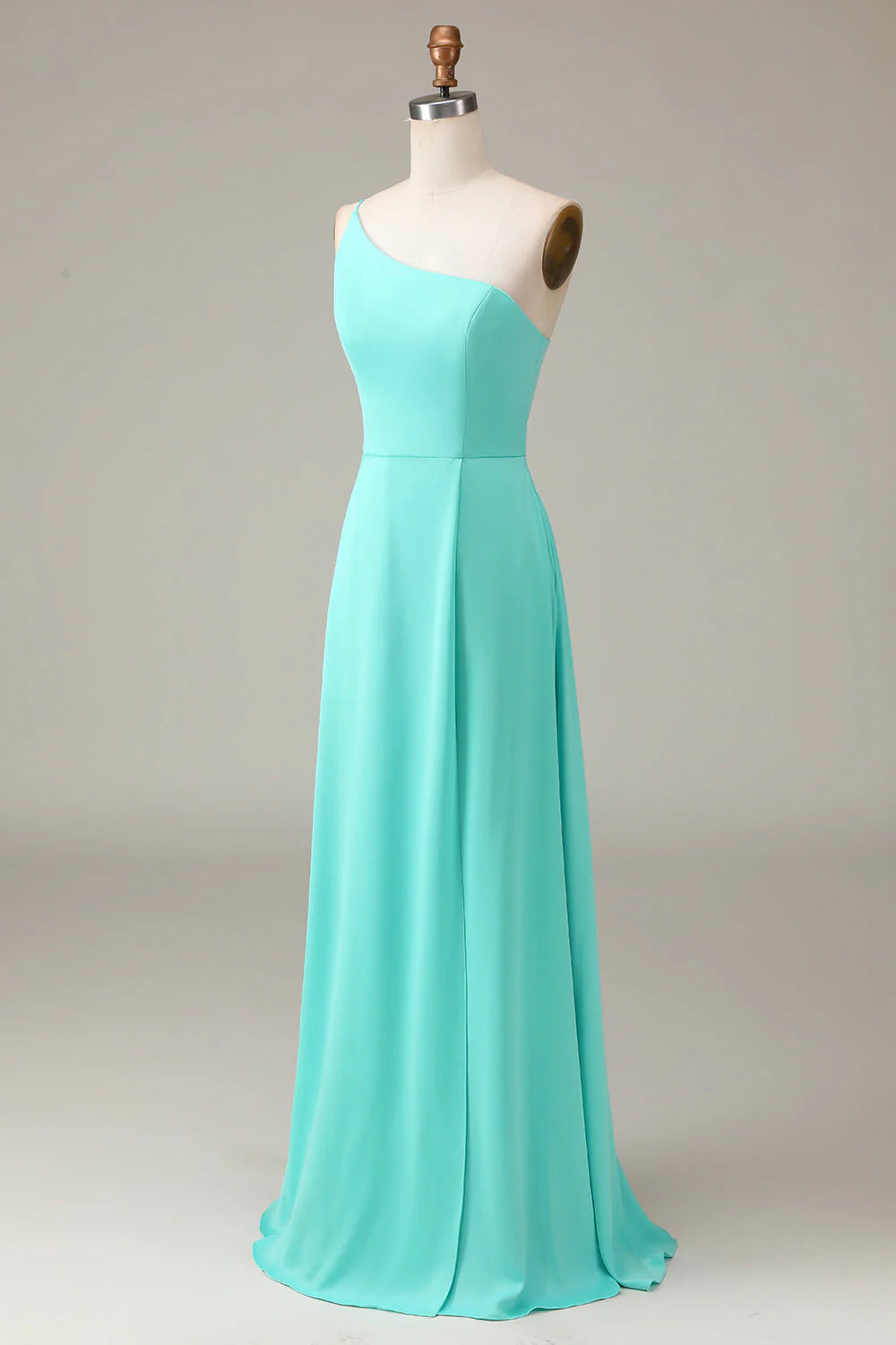Vestido de dama de honor de gasa con corte en A y un hombro hasta el suelo