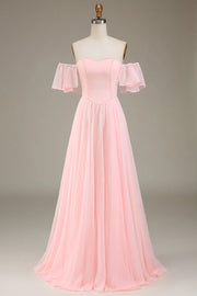 Vestido largo de dama de honor en gasa rosa ruborizado con hombros descubiertos y corte A