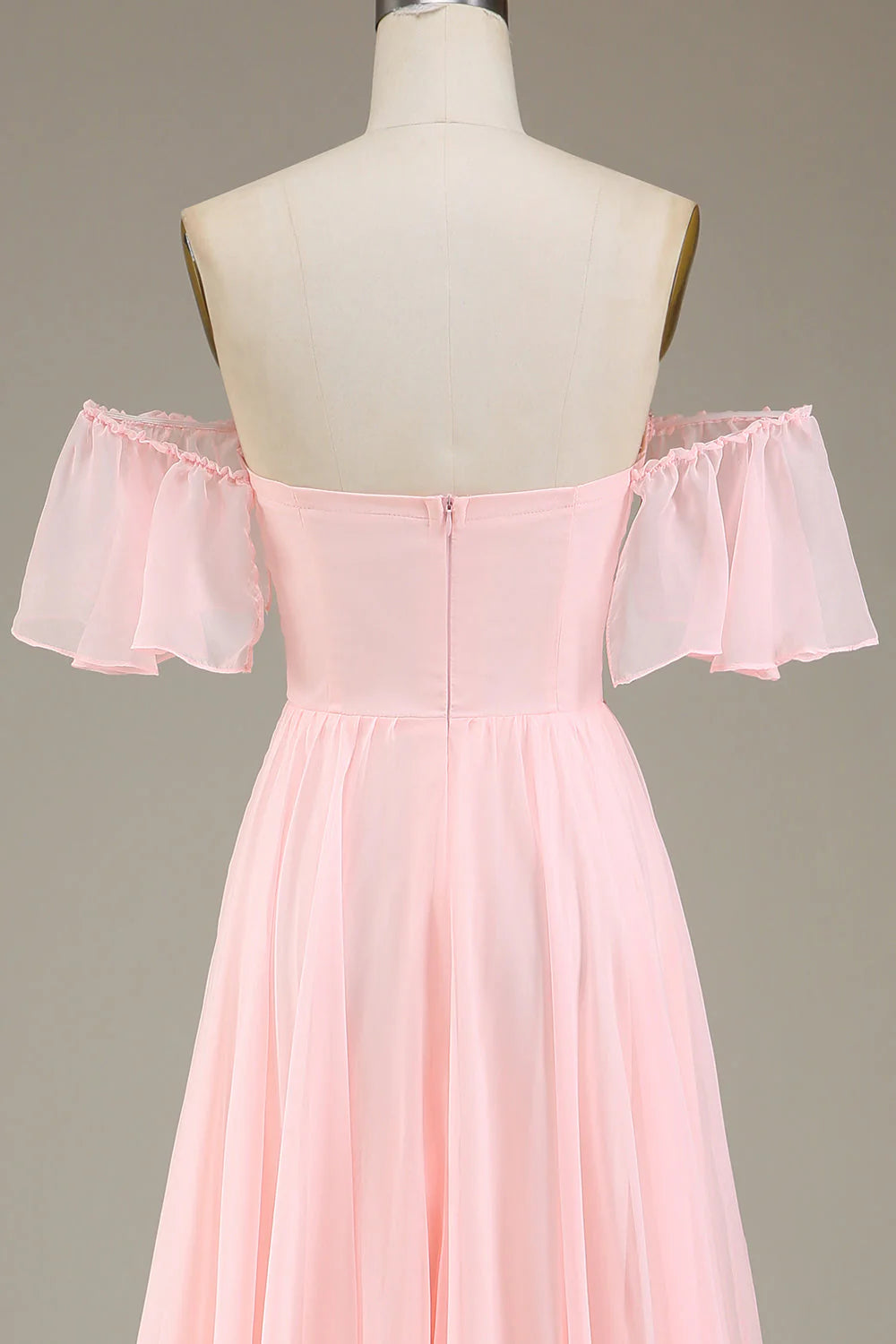 Vestido largo de dama de honor de gasa con hombros descubiertos y corte A en rosa ruborizado