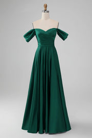 Vestido largo de dama de honor de satén con hombros descubiertos y corte en A