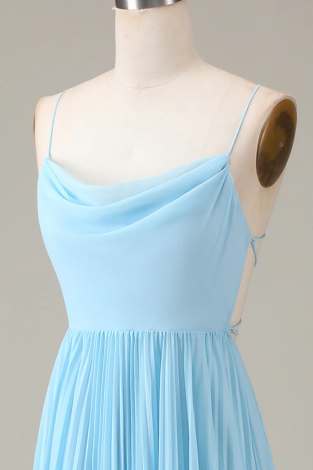 Vestido de dama de honor de gasa en línea A, plisado, con cuello vuelto y tirantes finos en azul cielo.