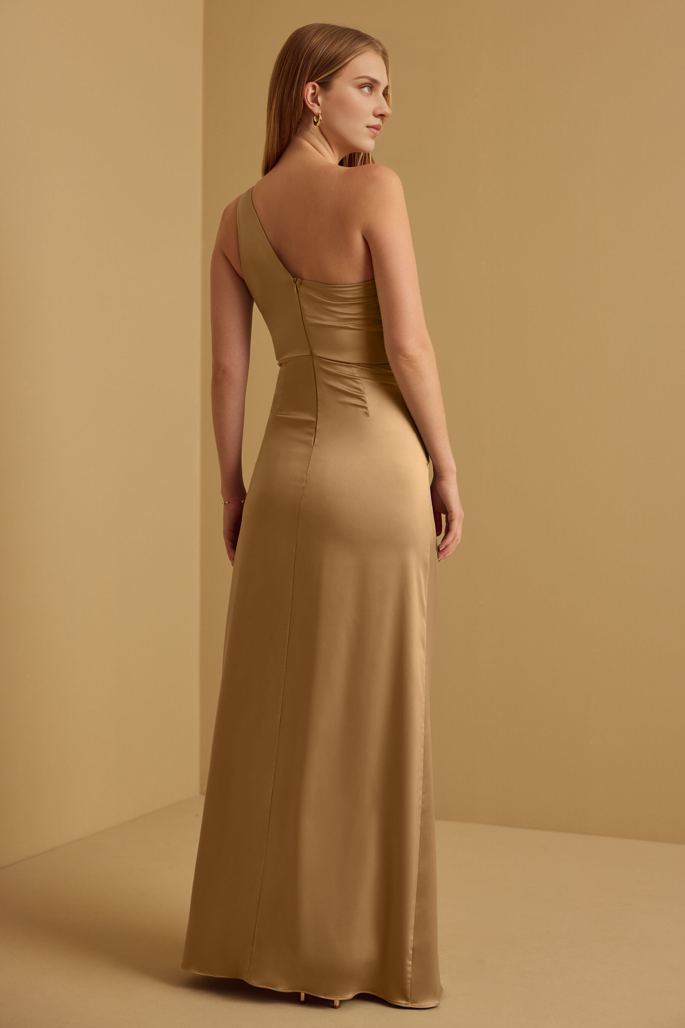 Vestidos formales Weitese sin mangas de satén con un solo hombro plisado hasta el suelo para dama de honor, tiendas con vestidos de fiesta con abertura lateral - EE. UU. 2 / Reino Unido 6 / UE 32
