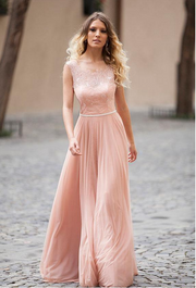 Vestidos de fiesta modestos de gasa con encaje rosa ruborizado, sin mangas, sin espalda, corte A, largos, vestidos formales para mujer - EE. UU. 2 / Reino Unido 6 / UE 32