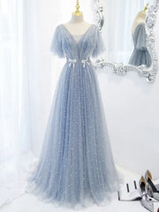 Vestidos de fiesta largos de noche con escote en V, tul y cuentas en azul, sin espalda y lazo