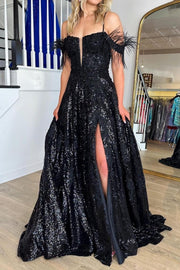Hermoso vestido Weitese de corte A con hombros descubiertos y lentejuelas negras con plumas - EE. UU. 2 / Reino Unido 6 / UE 32