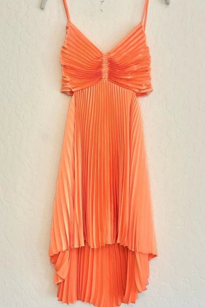 Vestido corto plisado naranja con tirantes finos, corte A, sin mangas, para fiesta y regreso a casa. - Naranja / EE. UU. 2 / Reino Unido 6 / UE 32
