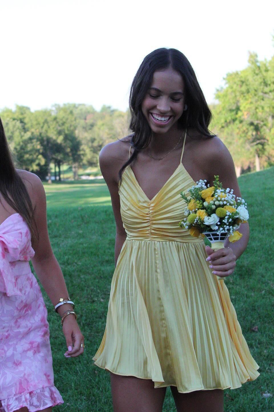 Vestido corto plisado naranja con tirantes finos, corte A, sin mangas, para fiesta y regreso a casa.