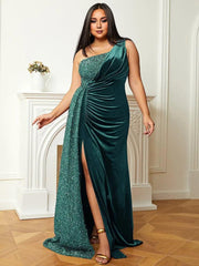 weitese's Elevate your sophisticated look with this emerald green plus size one-shoulder velvet maxi dress. It features a sleek one-shoulder neckline for modern allure, plush velvet fabric for luxurious texture, and a dramatic sequin drape detail with a high side slit for glamorous flair. The figure-hugging silhouette ensures a polished finish, making it perfect for formal events, evening galas, or any occasion where you want to blend rich texture with inclusive design.