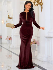 weitese's Elevate your luxurious elegance with this burgundy velvet maxi dress. It features plush velvet fabric with long sleeves for opulent allure, a plunging keyhole neckline for refined charm, and a figure-hugging mermaid silhouette for sophisticated flair. The rich burgundy hue ensures a timeless finish, making it perfect for formal events, evening galas, or any occasion where you want to blend classic luxury with textural, eye-catching design.