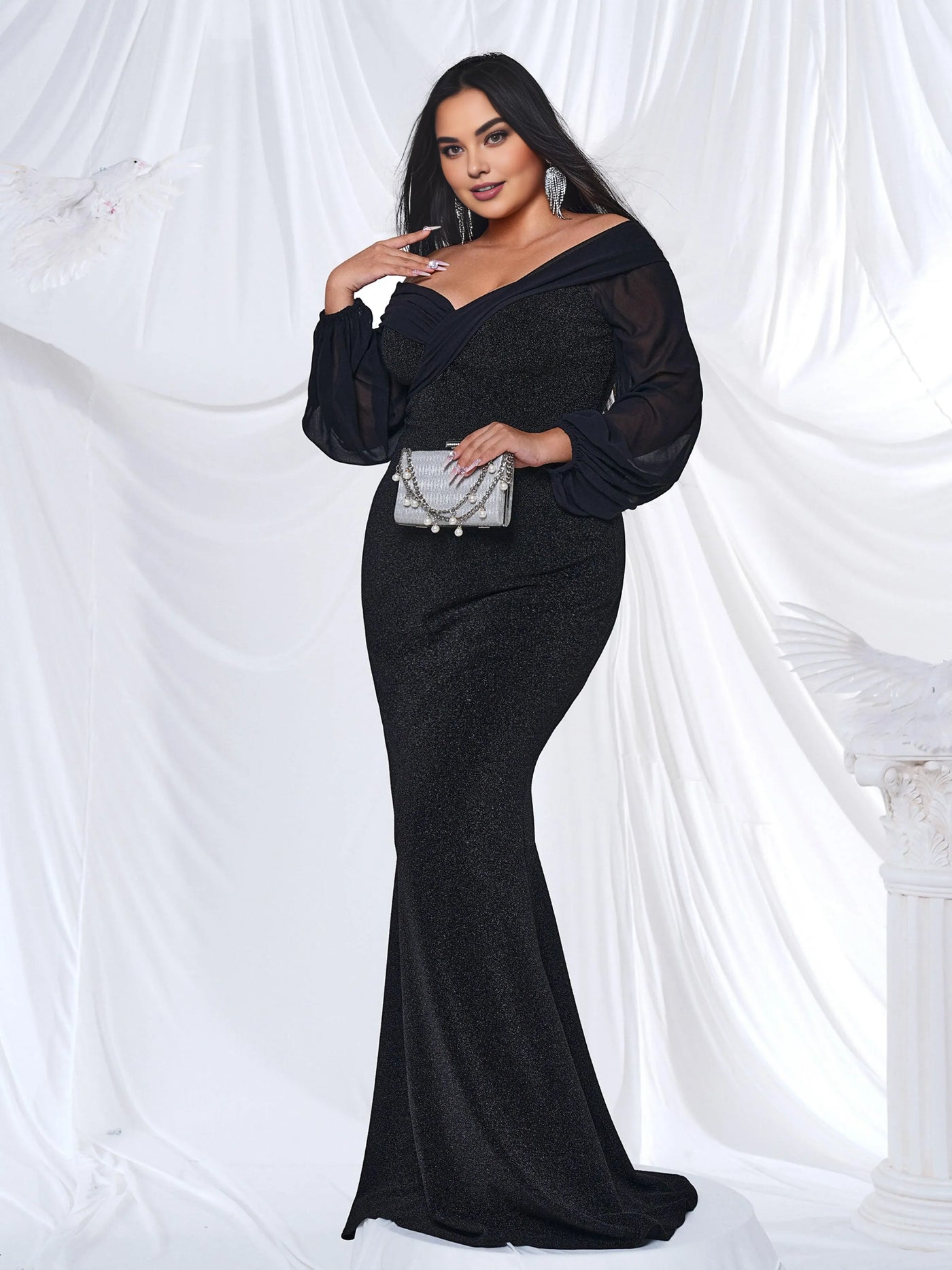 weitese's Elevate your glamorous look with this black glitter plus size off-shoulder maxi dress. It features shimmering glitter fabric for opulent allure, an off-shoulder neckline with sheer puff sleeves for refined charm, and a mermaid silhouette for sophisticated flair. The classic black hue ensures a versatile finish, making it perfect for formal events, evening galas, or any occasion where you want to blend timeless elegance with dramatic, textural design.