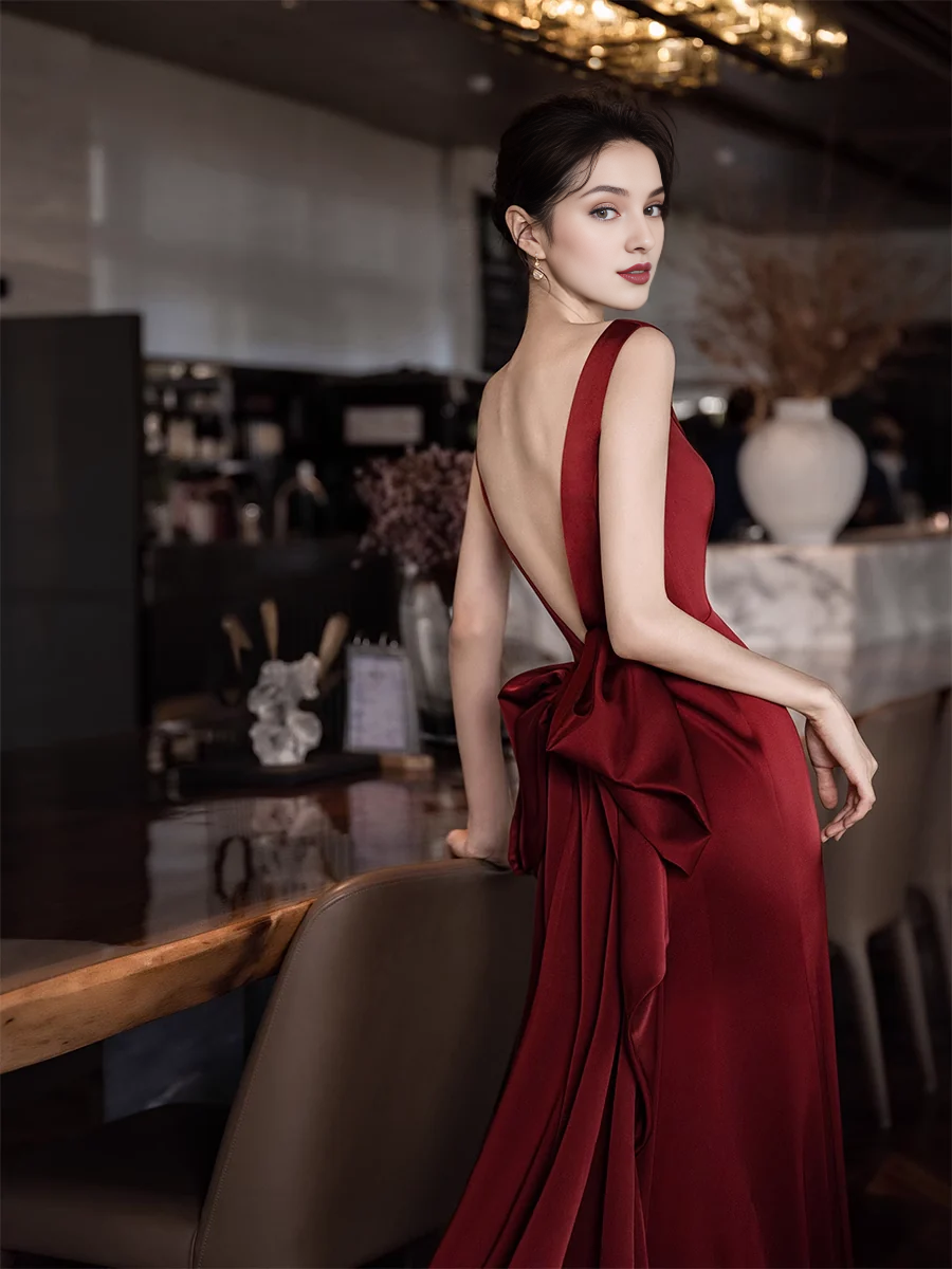 Vestido de fiesta largo color burdeos con cola, escote en V, sirena, sencillo, sin mangas, lazo y espalda descubierta - EE. UU. 2 / Reino Unido 6 / UE 32