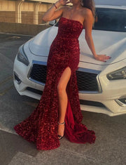 Vestidos de fiesta largos de sirena sin tirantes y escote corazón con abertura
