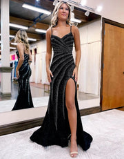 Vestido de fiesta de sirena con escote en V, tirantes finos, cola brillante y abertura - Negro / EE. UU. 2 / Reino Unido 6 / UE 32