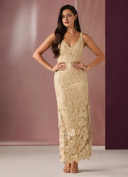 Vestido Weitese con escote en V profundo, champán, romántico, con flores 3D, maxivestido sin mangas, corte sirena, vestido de fiesta con abertura - EE. UU. 2 / Reino Unido 6 / UE 32