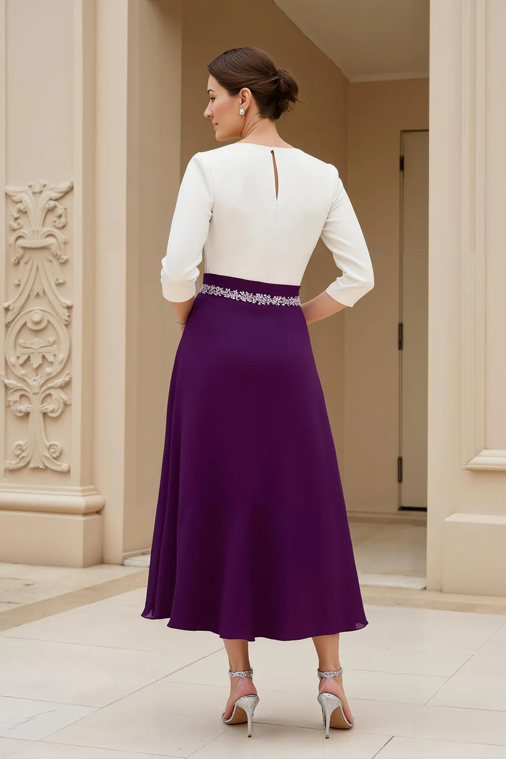 Elegant A Line Boat Neck Long Sleeve Scoop Back Tea-Length Mother of the Bride Dress - Purple / US 2 / UK 6 / EU 32