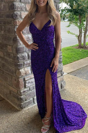 Vestido de fiesta largo de sirena con lentejuelas y abertura - Púrpura / EE. UU. 2 / Reino Unido 6 / UE 32