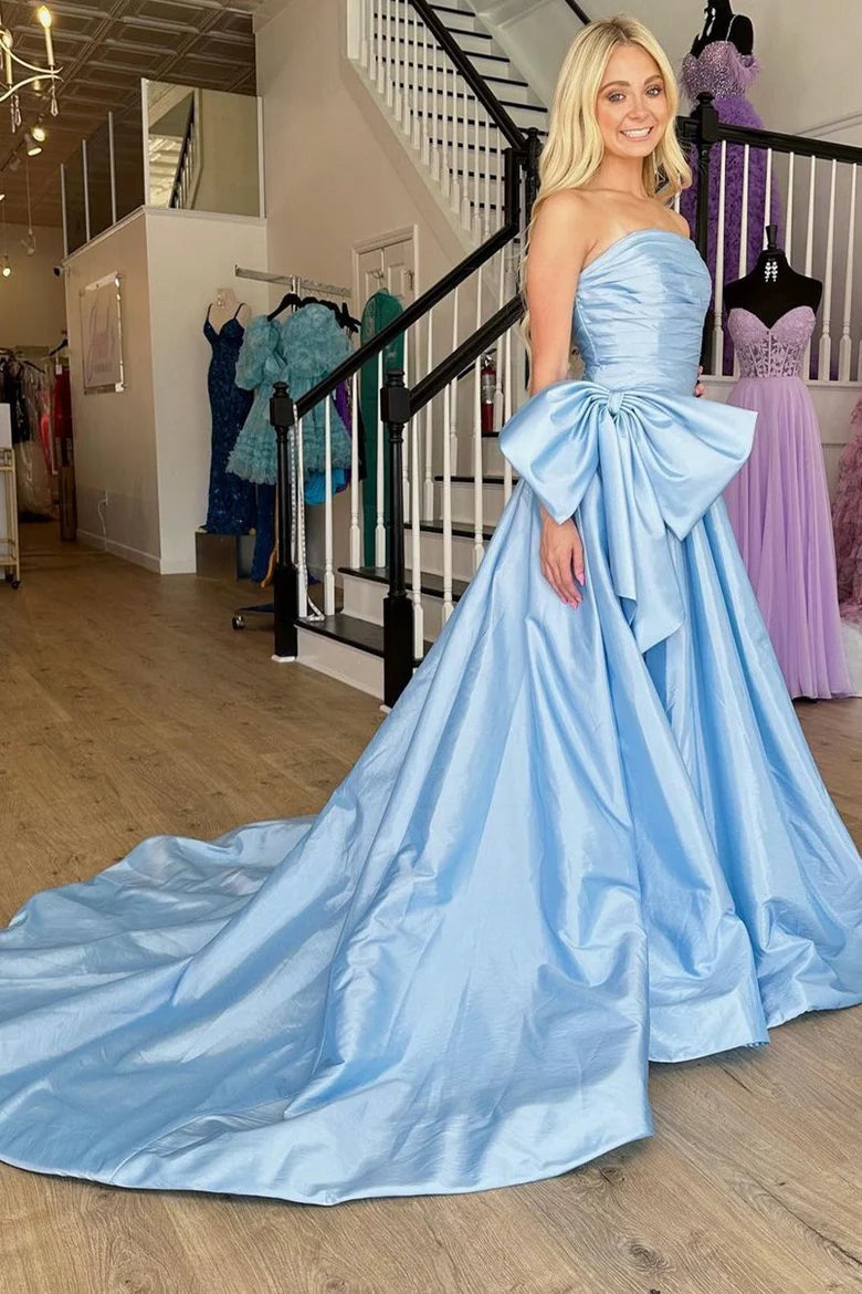 Vestido de fiesta con hombros descubiertos, corte A, sin tirantes, abertura con lazo y cola