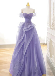Vestido de fiesta largo de tul con escote en forma de corazón y hombros descubiertos en color morado