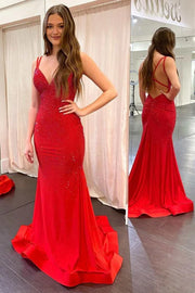Vestido de fiesta de sirena con escote en V, espalda descubierta y cola, con tirantes finos y cuentas