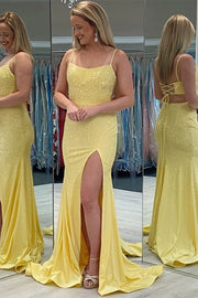 Vestido de fiesta largo con tirantes finos, corte sirena, brillante y abertura