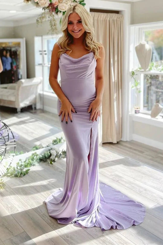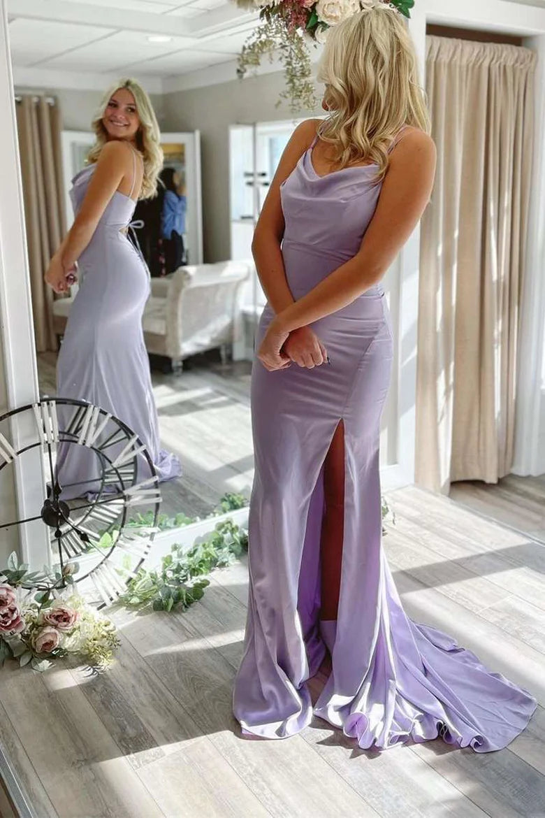 Vestido de fiesta de sirena con tirantes finos, escote vuelto y abertura lateral en satén - Lavanda / EE. UU. 2 / Reino Unido 6 / UE 32