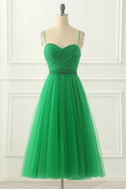 Vestido de fiesta verde de tul con tirantes finos y fajín