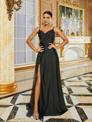weitese's Elevate your glamorous look with this black satin maxi dress. It features lustrous satin fabric paired with glitter mesh detailing for opulent allure, a V-neckline with spaghetti straps and a sheer back for refined charm, and a high slit with a flowing silhouette for sophisticated flair. The classic black hue ensures a versatile finish, making it perfect for formal events, evening galas, or any occasion where you want to blend timeless elegance with dramatic, sparkling design.