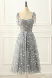 Vestido de fiesta gris midi de tul con corte en A y corazones