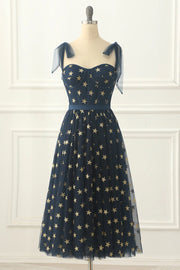 Vestido de fiesta azul marino midi de tul con corte en A y estrellas