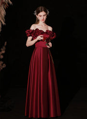 Vestido de noche largo con hombros descubiertos de satén rojo vino