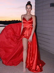 Vestidos de corte A/princesa de satén tejido con volantes, escote en V, sin mangas y cola larga
