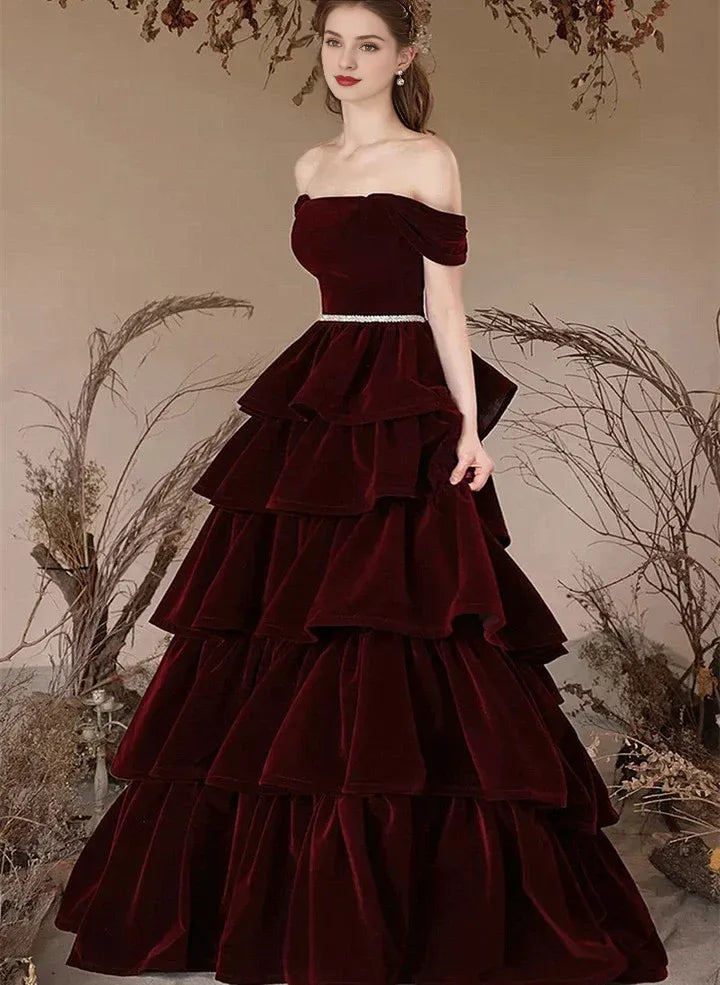 Vestido formal Weitese para mujer, color burdeos, con capas de terciopelo y hombros descubiertos, corte en A, para fiesta y graduación. Disponible en tienda.