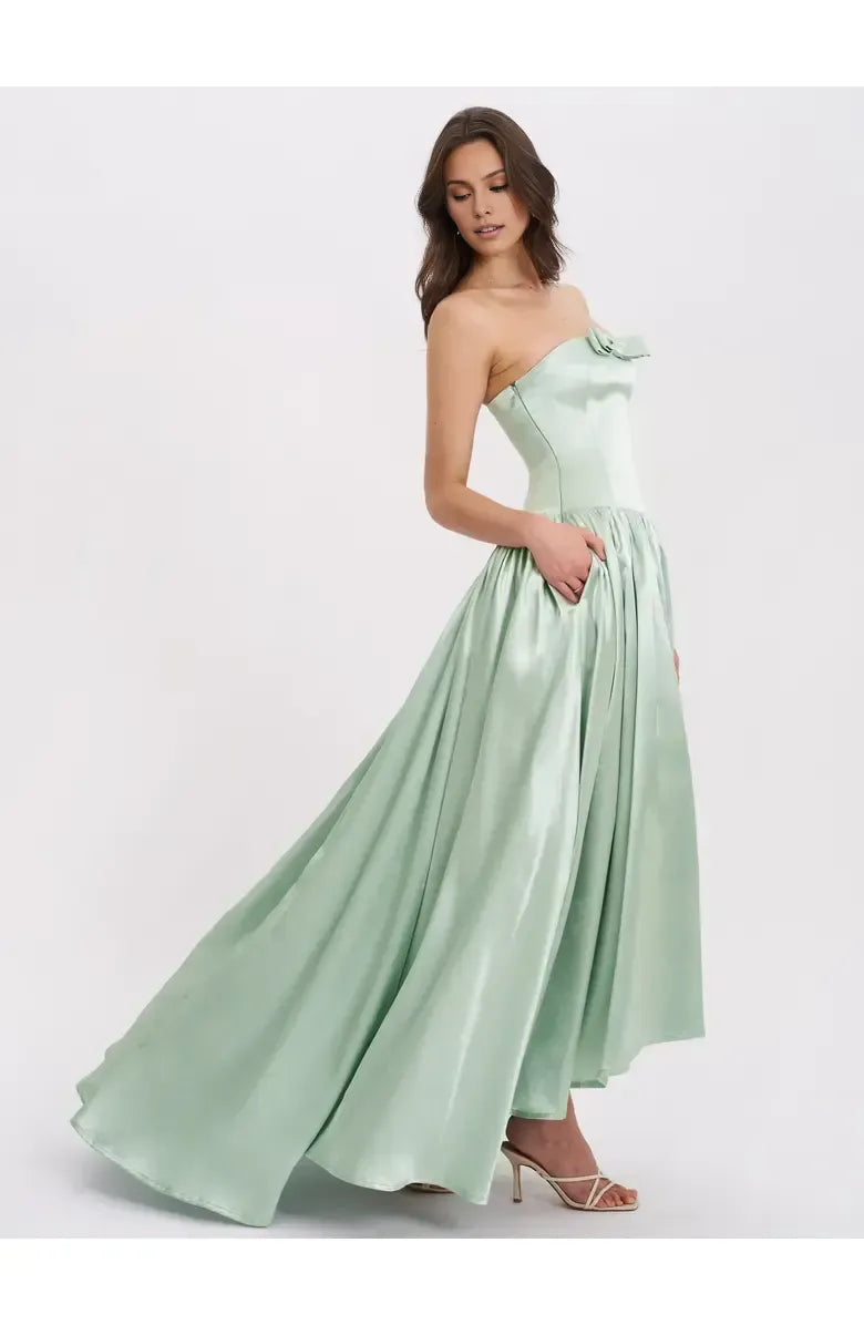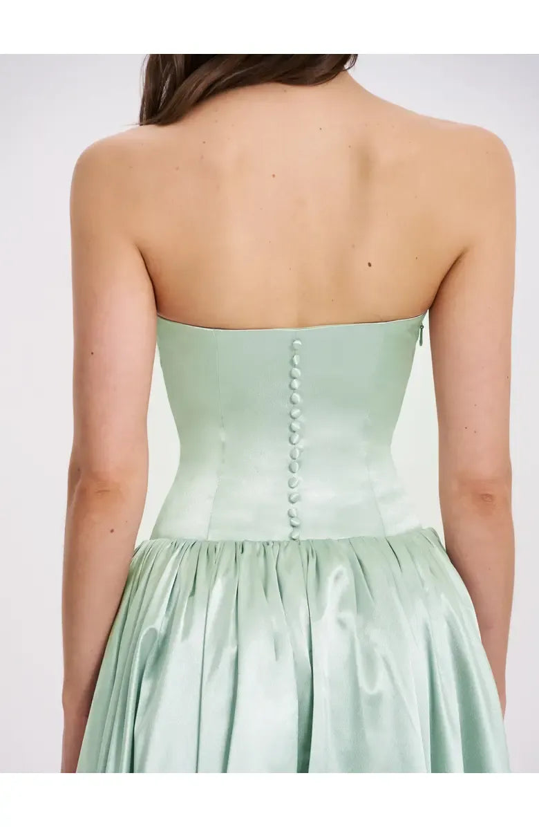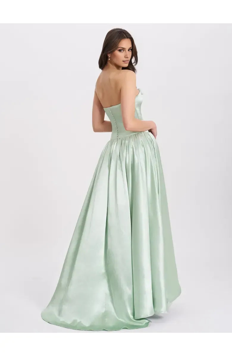weitese's Elevate your romantic allure with this mint green satin strapless high-low ball gown. It features luxurious satin fabric with a strapless neckline for elegant charm, a delicate bow detail that adds whimsical sophistication, a high-low hem that ensures dynamic movement, and a corset back for tailored fit. The soft mint green hue and voluminous silhouette make it perfect for formal events, weddings, or any occasion where you want to embrace feminine, show-stopping glamour.