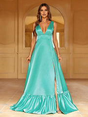weitese's Elevate your formal look with this teal satin plunging V-neck maxi dress. It features a daring plunging V-neckline with a matching open back for alluring charm, a flowing silhouette with a ruffled hem for dramatic movement, and a high side slit for modern flair. The lustrous satin fabric ensures a polished finish, making it perfect for red carpet events, formal galas, or any occasion where you want to blend bold color with timeless sophistication.