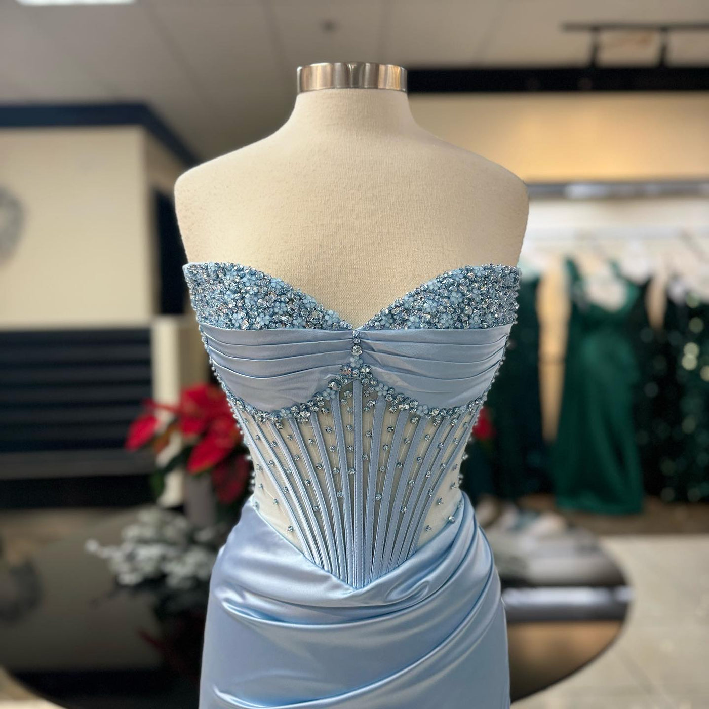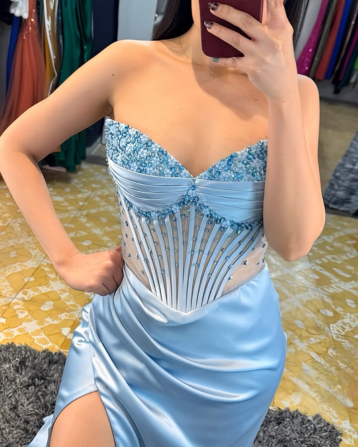 Vestido Weitese sexy sin tirantes, vestido de fiesta, ilusión simple, abertura lateral, corsé con cuentas, vestido de noche de línea A