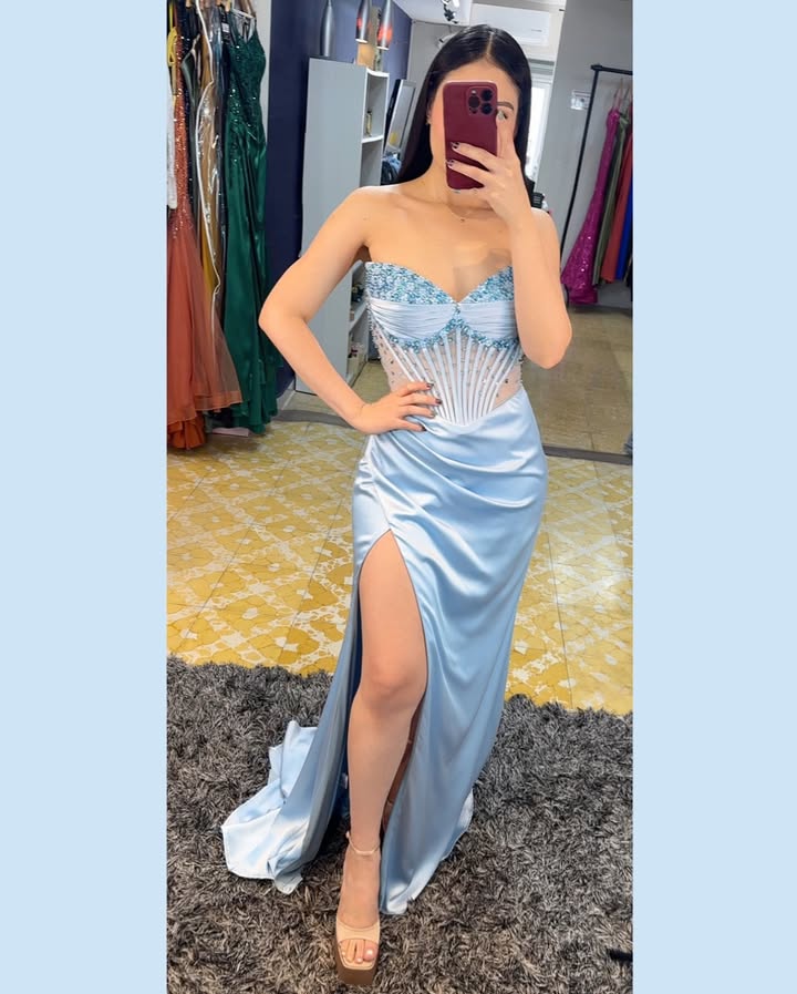 Elegante y seductor, el vestido Weitese es imprescindible para cualquier ocasión especial. Su diseño sin tirantes luce una abertura lateral efecto ilusión y una silueta en A que realza la figura. El corpiño tipo corsé está adornado con delicadas cuentas que le dan un toque de glamour. Perfecto para graduaciones, bodas o cualquier evento formal.