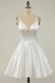 Vestido corto de satén con tirantes dobles para fiesta de bienvenida