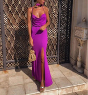 Vestido de fiesta sexy de satén con tirantes finos, espalda descubierta y abertura lateral