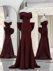 Vestidos de fiesta largos de satén burdeos con hombros descubiertos y sencillos