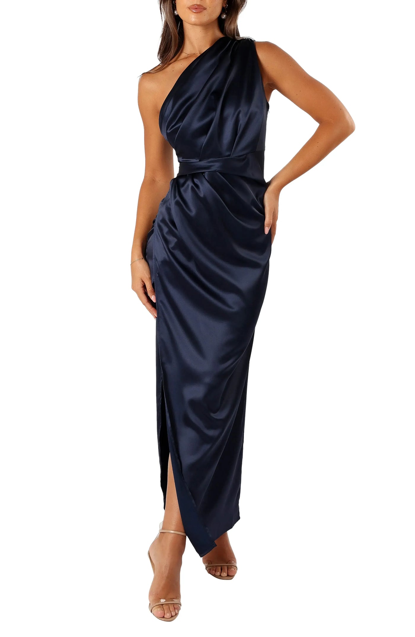 weitese's Elevate your glamorous allure with this black satin one-shoulder midi dress. It features luxurious satin fabric with a one-shoulder neckline for opulent charm, a high slit and draped bodice for refined elegance, and a figure-hugging silhouette that adds a touch of bold flair. The classic black hue ensures a captivating finish, making it perfect for cocktail parties, formal events, or any occasion where you want to embrace timeless luxury with polished, show-stopping style.