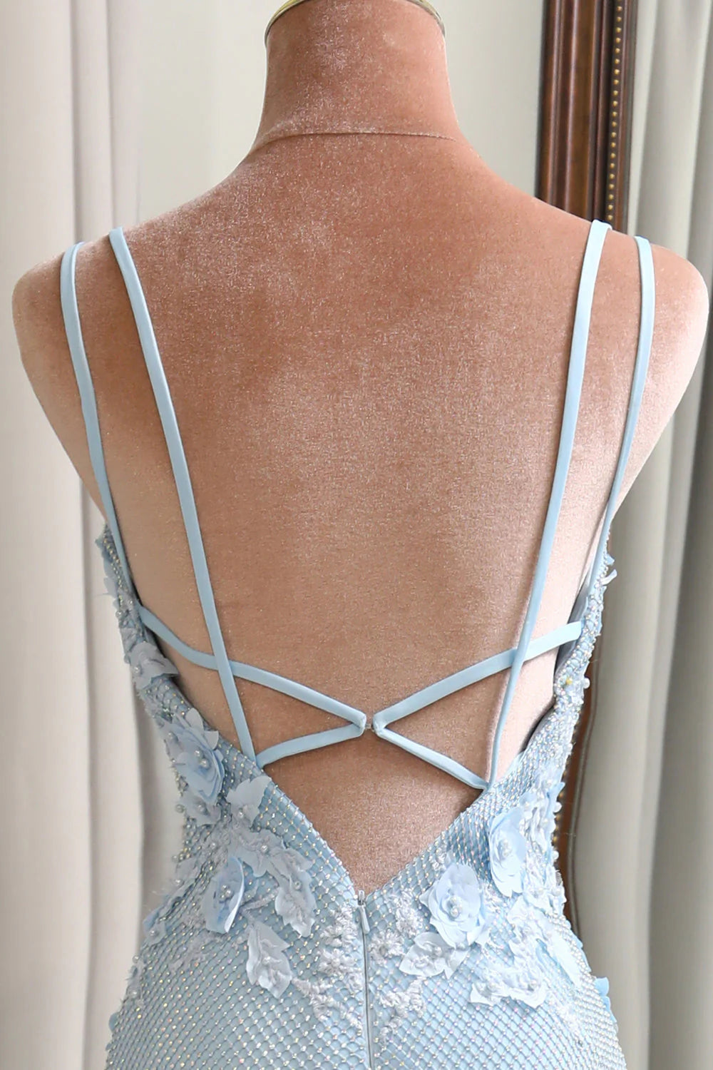 Vestido de fiesta azul claro con lentejuelas y corsé largo de sirena con abertura