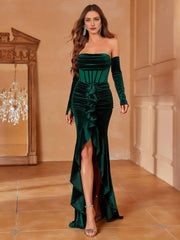 Elegante vestido de noche largo con hombros descubiertos, dobladillo fruncido, volantes de terciopelo y puños/Vestidos de noche para mujer