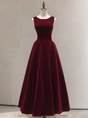 Vestidos de fiesta largos de terciopelo burdeos, sencillos, sin mangas, corte en A, escote redondo y terciopelo