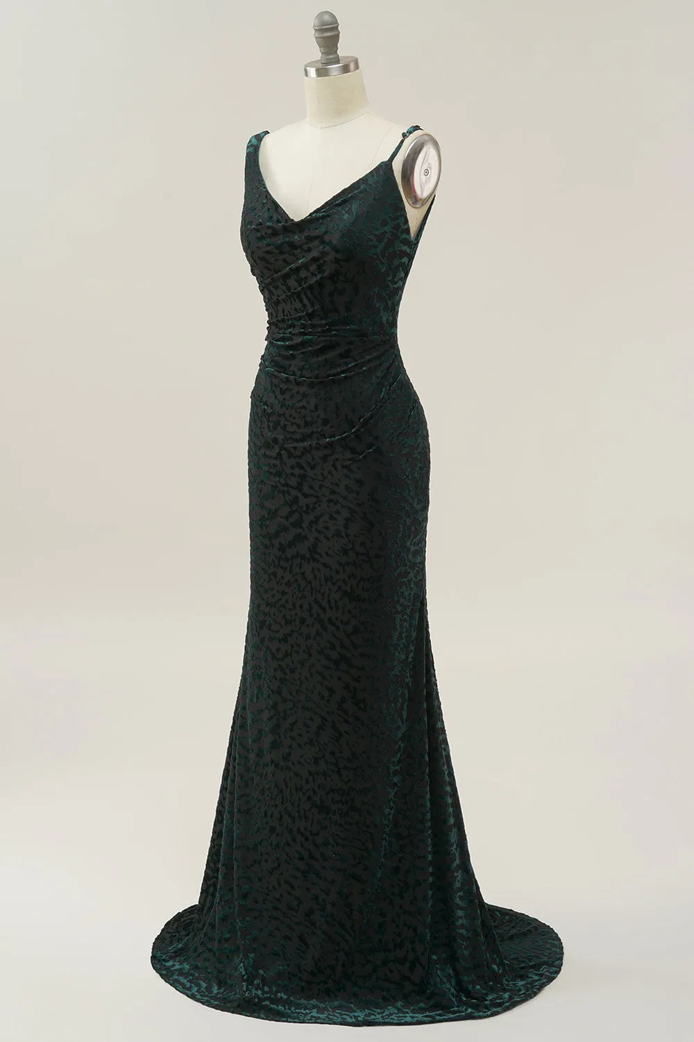 Vestido largo de fiesta de terciopelo verde, sin mangas, espalda descubierta, largo hasta el suelo, corte sirena, escote en V