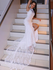 Vestidos de novia de corte trompeta/sirena con encaje, sin mangas, cuello halter y cola larga