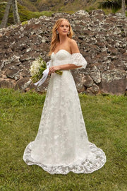 Vestido de novia romántico con hombros descubiertos y estampado floral blanco