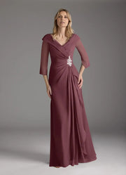 Vestido elegante para madre de la novia, corte A, escote en V, plisado, largo hasta el suelo, manga tres cuartos, color liso - EE. UU. 2 / Reino Unido 6 / UE 32